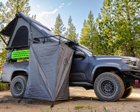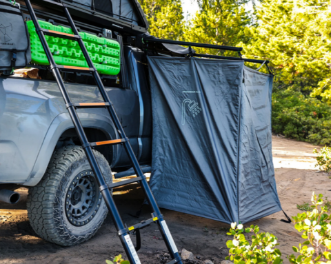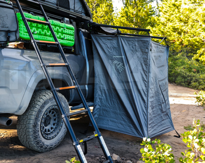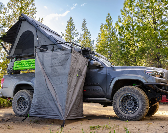 Přístup do vozidla: Přístupový otvor umožňuje nastupování a vystupování z vozidla, takže nemusíte sprchový stan pokaždé balit, když potřebujete přístup.