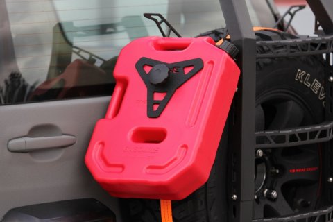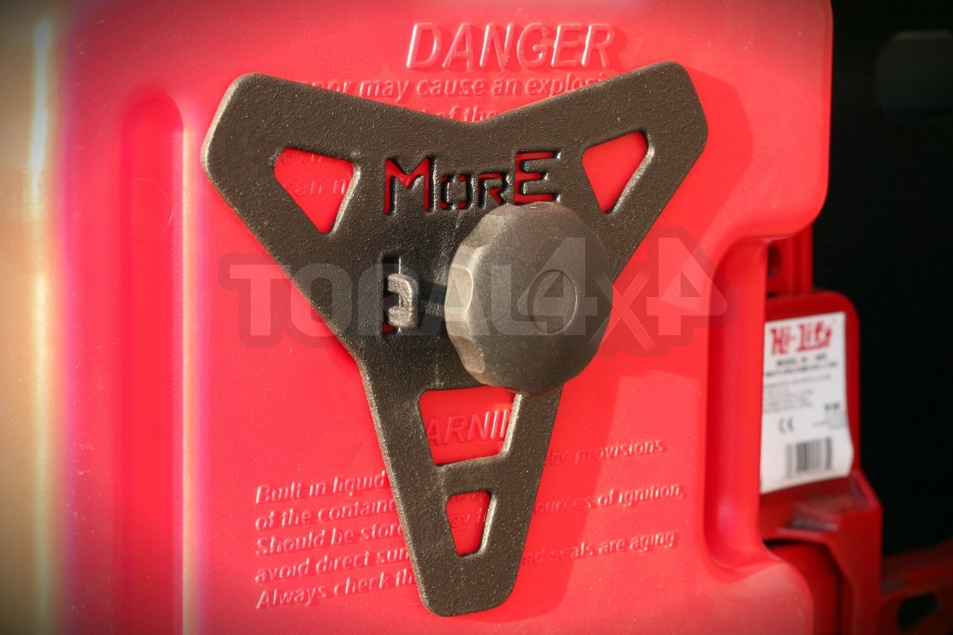 Držák kanystru MorE 4x4 umožňuje namontovat jeden kanystr na  jakýkoli rovný prostor, min. na  držák zadního nárazníku.