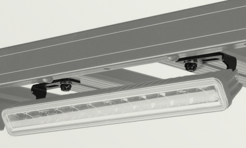 Montážní držáky upevňují tuto světelnou lištu na přední část nosiče pomocí horních T-drážek předního kombinovaného lamelového profilu nebo na boční stranu pomocí T-drážek lamel podnosu.