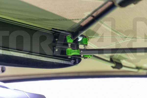 Střešní rám a opěrné nohy markýzy jsou vyrobeny z hliníkové trubky o průměru 25/22 mm s práškovým nástřikem černé barvy.