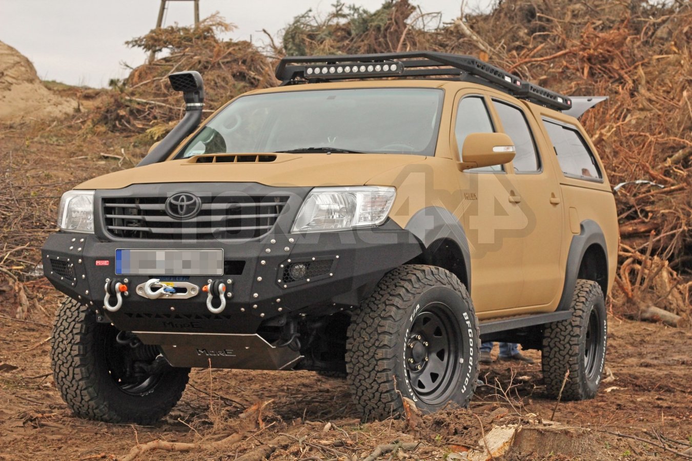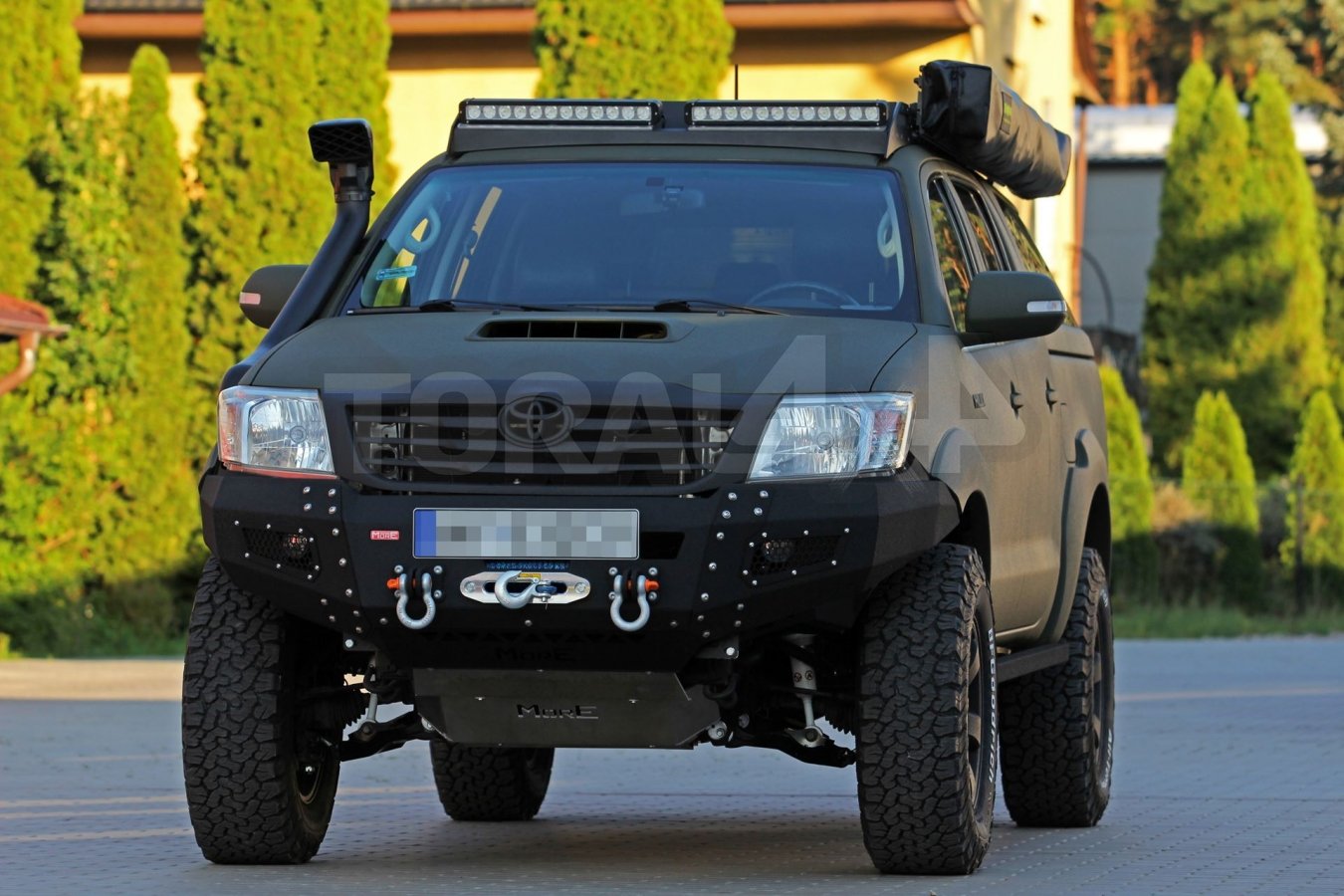 Nárazník má vestavěné dva držáky pro denní nebo mlhové světla, zesílené úchyty pro držáky šeklů a montážní desku navijáku.
