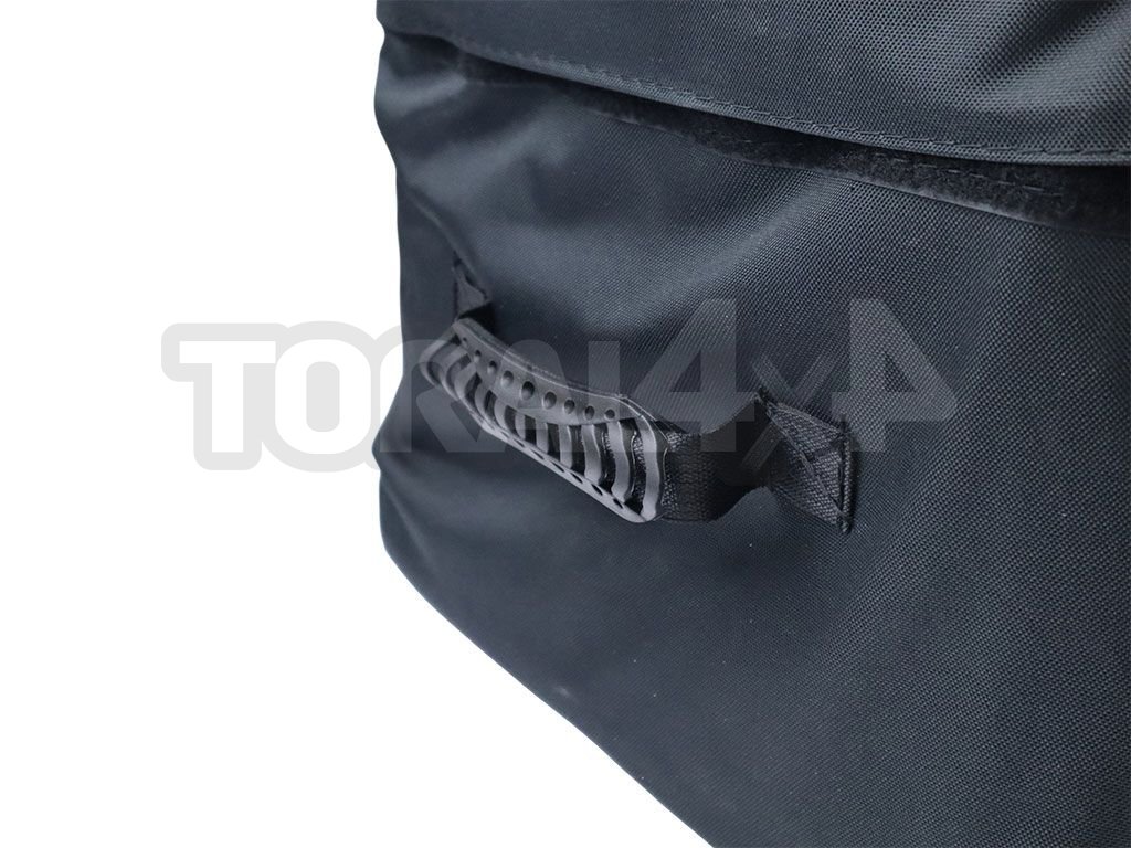 6 Trojitě prošitých štítků pro provlečení Stratchitů (nebo podobných popruhů) a připevnění tašky ke střešnímu nosiči Front Runner nebo jinému nákladnímu nosiči.