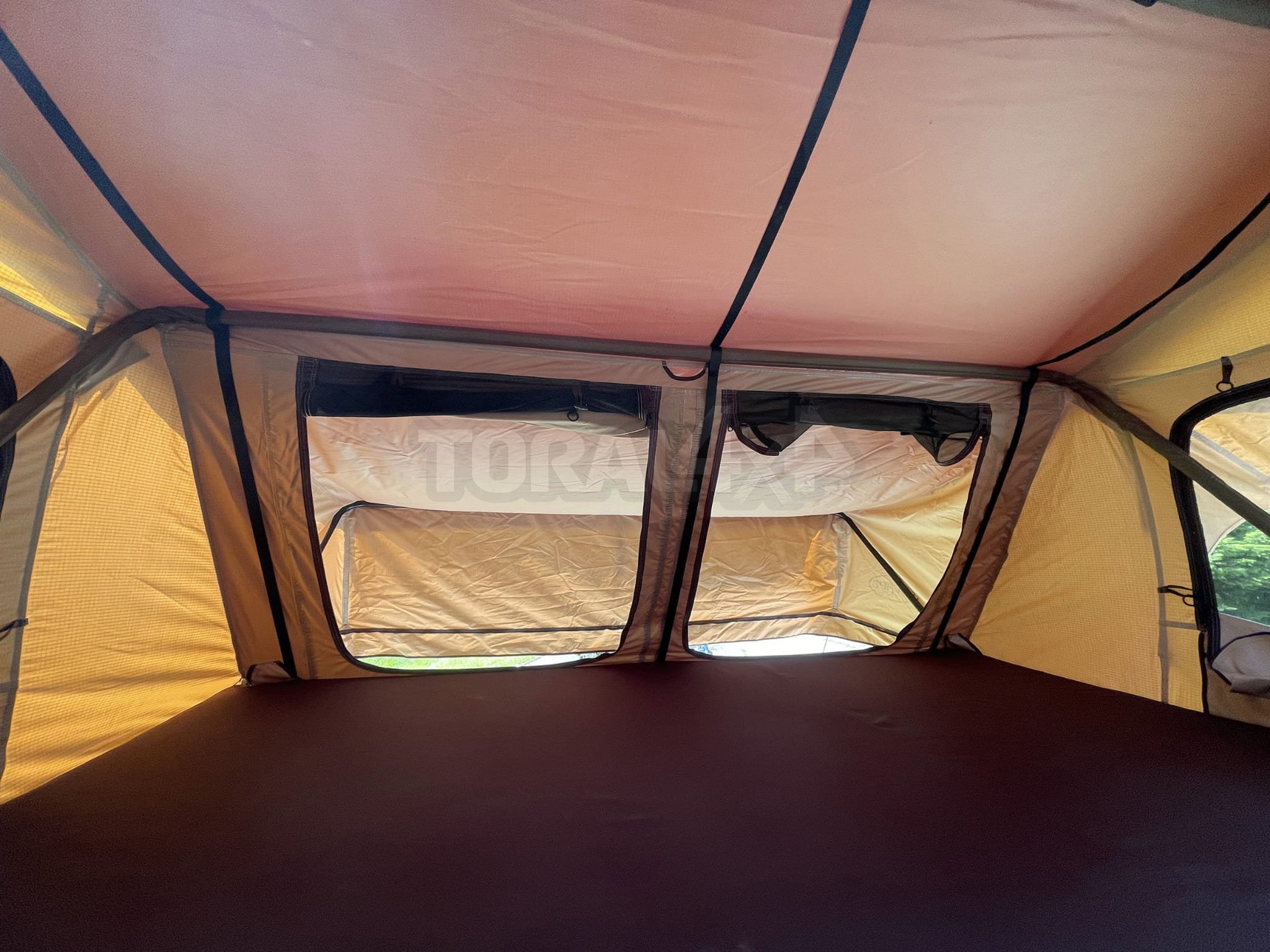 - flysheet - voděodolný 420D Oxford polyester. Přídavný rám zaručuje proudění vzduchu mezi flysheetem a střechou stanu. V tropech jsou nad střešními okny instalovány dvě profesionální fólie.