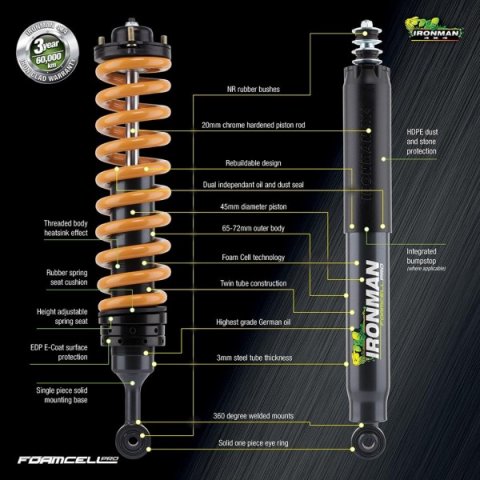 Řada Ironman 4x4 Foam Cell Pro je navržena tak, aby splňovala všechny požadavky a výzvy vozidla, kterým čelí jak na silnici, tak v terénu, naložené nebo vyložené, a zároveň přináší vynikající jízdu.